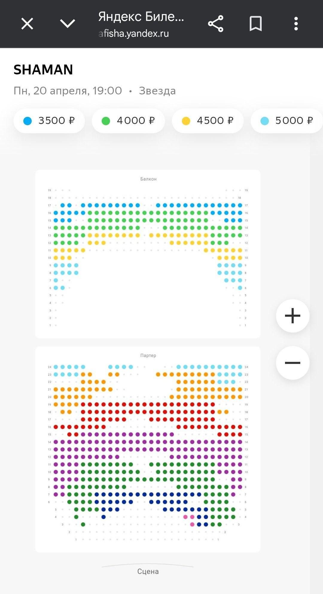 Мероприятие носит название «SHAMAN, 30 лет на сцене». На схеме зала цветными кружочками отмечены нераспроданные места.