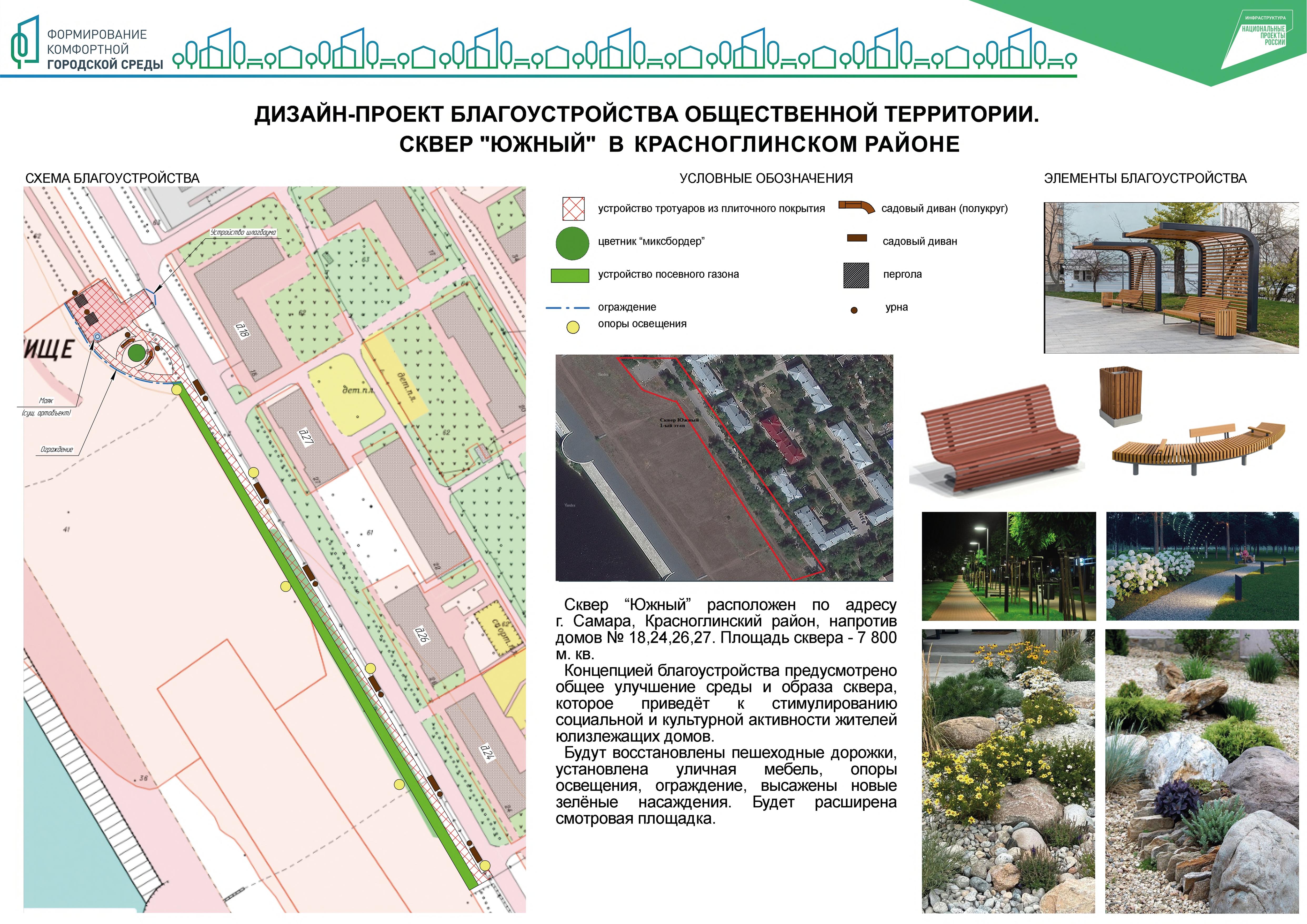 В Красноглинском районе на обновление претендуют два сквера. Первый — сквер «Южный» в одноимённом посёлке. «Проектом благоустройства предполагается расширение и благоустройство существующей смотровой площадки с видом на Волгу, устройство тротуара, установка опор освещения, садовых диванов и урн до санатория „Красная Глинка“», — пояснил глава Красноглинского района Вячеслав Коновалов.