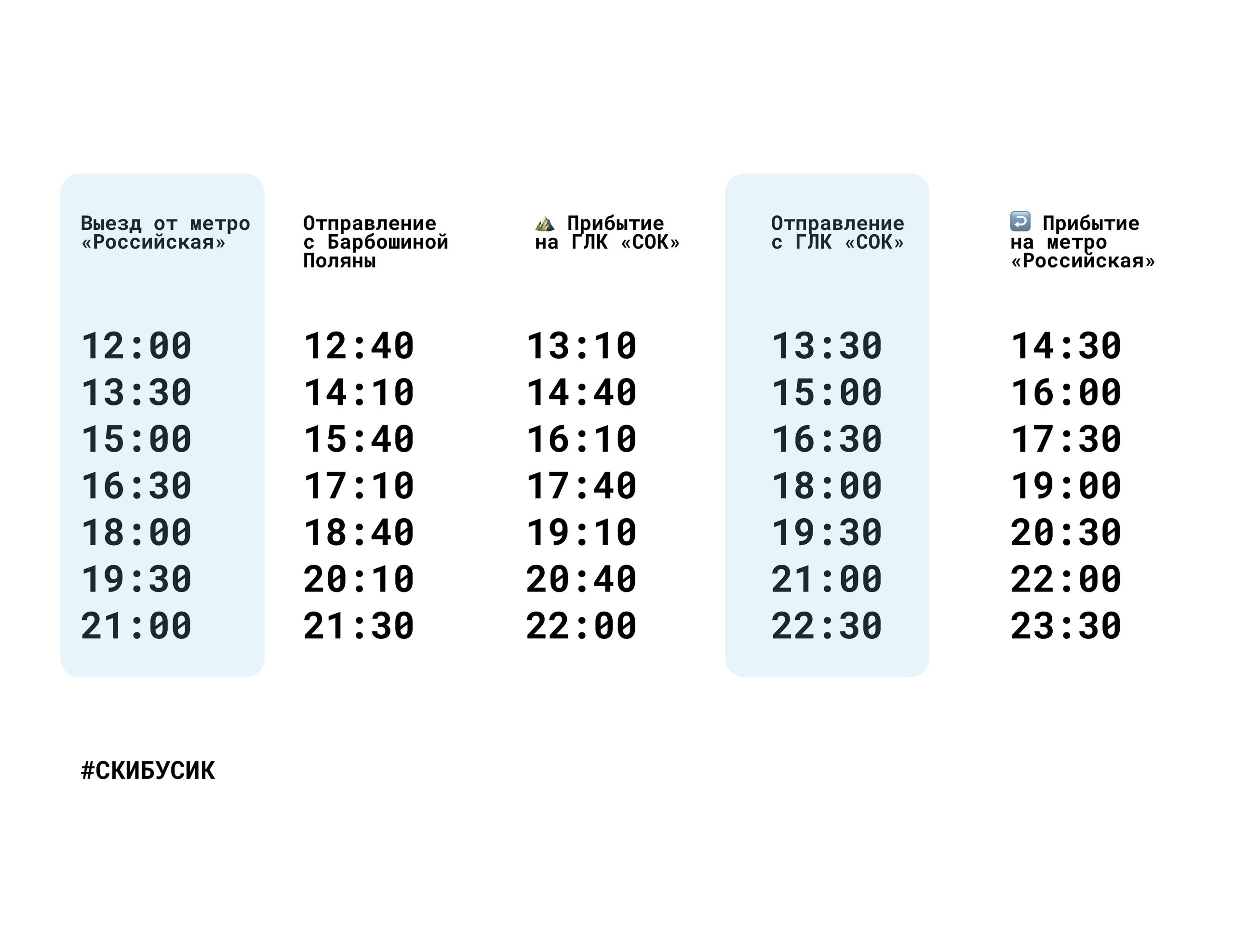 Горнолыжный комплекс «СОК» в Самаре организовал бесплатный автобус-шаттл для посетителей. Транспорт курсирует со вторника по пятницу по маршруту: станция метро «Российская» — Барбошина Поляна (с изменённой точкой посадки) — ГЛК «СОК» и обратно.