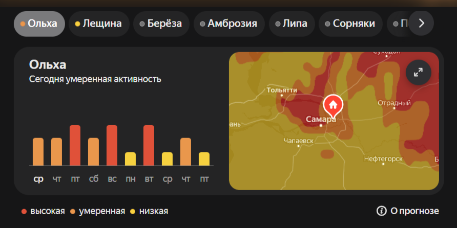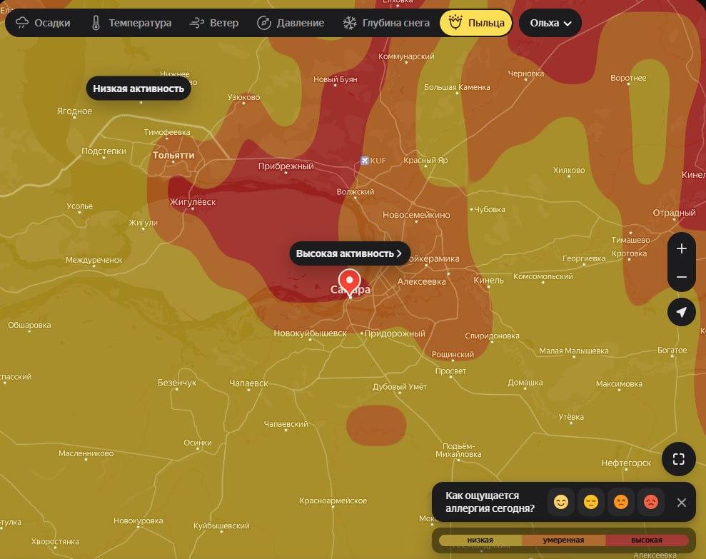 Сервис «Яндекс.Карты» обновил данные по аллергенам в Самарской области. На 1 апреля высокая активность пыльцы зарегистрирована в таких населённых пунктах, как Алексеевка, Кинель, Комсомольский, Домашка, Максимовка, Богатое, Безенчук, Хворостянка и Нефтегорск. В Самаре, Тольятти и Жигулевске уровень пока умеренный, но расслабляться не стоит: в воздухе присутствует пыльца ольхи и лещины, а вскоре ожидается появление основного весеннего аллергена — берёзы.
