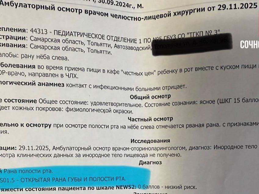 «Мы молились, чтобы он не проглотил осколки, чтобы не было внутренних повреждений. Спасибо, пронесло. Позже знакомые рассказали, что в этом заведении им попадались в еде и мухи, и тараканы. Но стекло, которым режутся дети, — это не халатность. Это преступная безответственность. Я пишу это не для мести. Я пишу, потому что это мог быть ваш ребёнок. Ваш обед. Ваши слёзы в больничном коридоре в самый обычный выходной день. И ваша паника при виде крови во рту у малыша», — написала жительница Тольятти.
