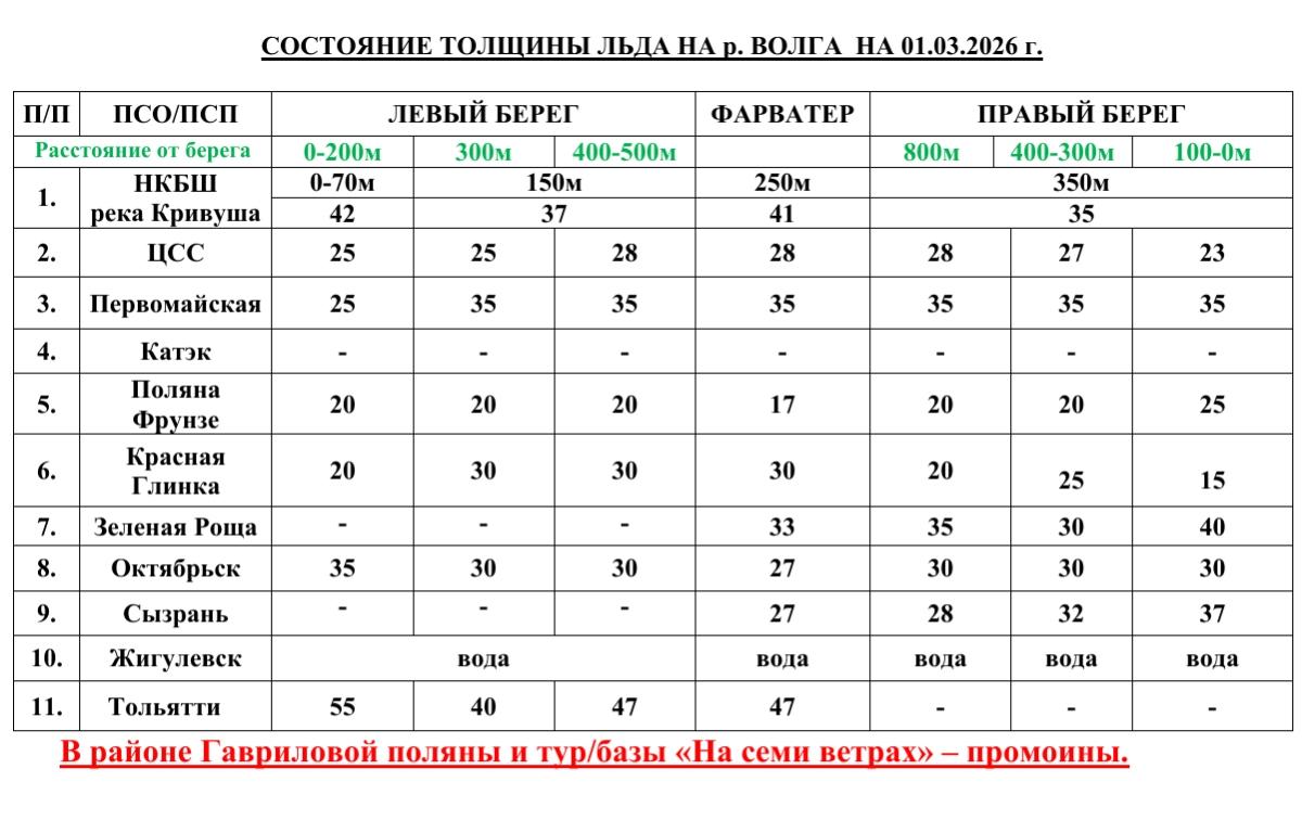Свежие данные о толщине льда на Волге в табличной форме