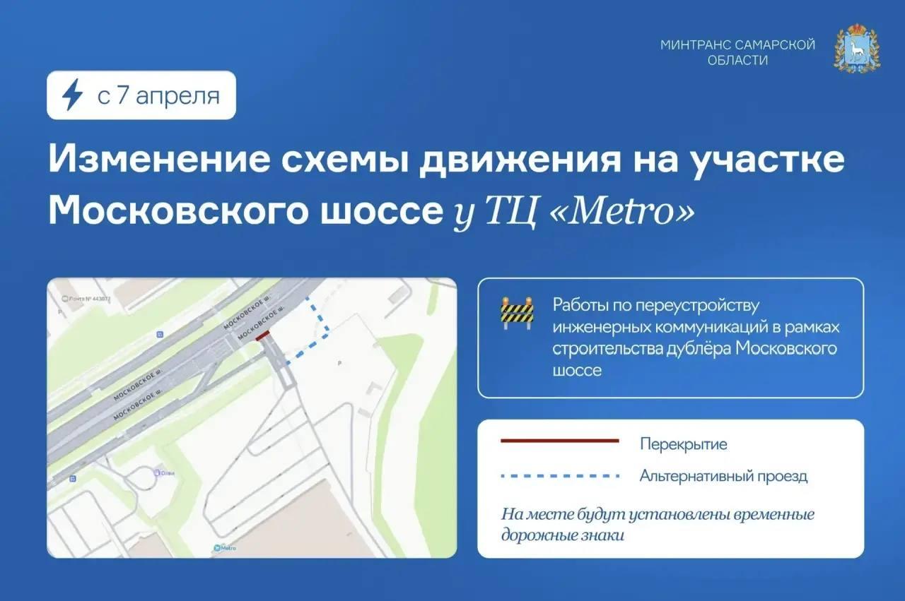 В Самаре с 7 апреля временно поменяется схема движения на Московском шоссе. Причиной стали дорожные работы по возведению дублирующей магистрали.