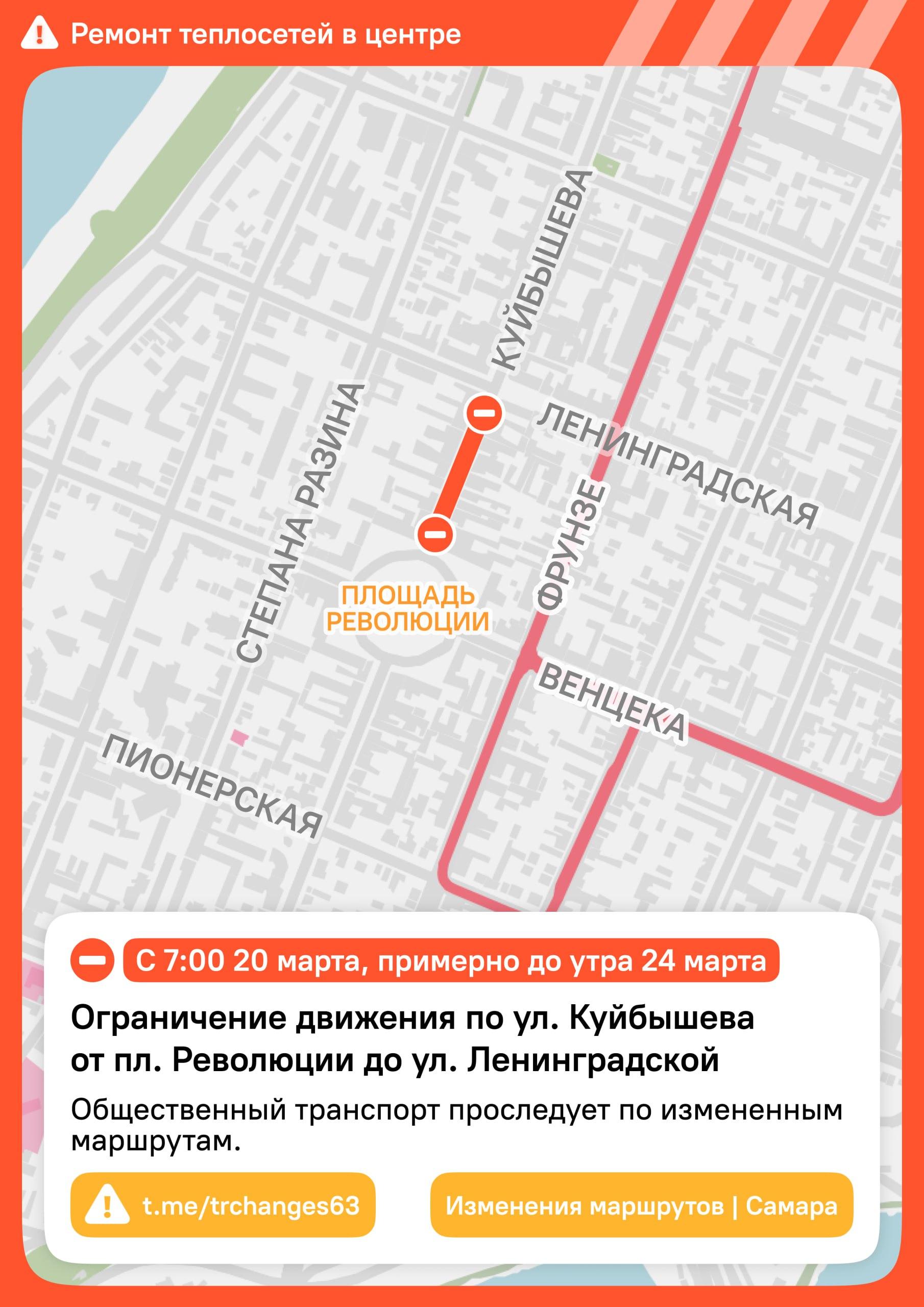 С пятницы, 20 марта, в исторической части Самары будет частично перекрыта улица Куйбышева на участке от Ленинградской до Венцека. Ограничение движения, связанное с ремонтными работами на теплотрассе, продлится до утра 24 марта. Как сообщили в городской администрации, перекрытие начнётся в 7:00 20 марта и завершится в 6:30 24 марта.